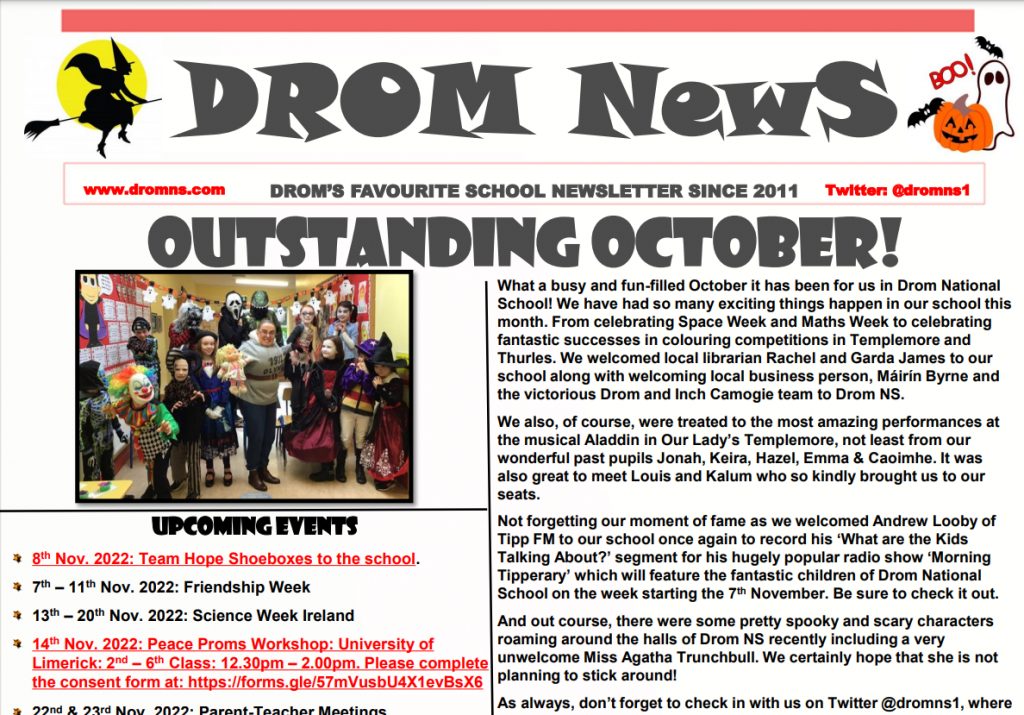 We are delighted to share with the school community that the October edition of Drom NewS is now available to view at the following link http://www.dromns.com/index.php/newsletter/. Our newsletters are password protected so please get in touch with Debbie in the office or with a note in your child’s diary if you wish to get the password sent to you once again. We hope you enjoy the second of our newsletters for 2022 – 2023!
